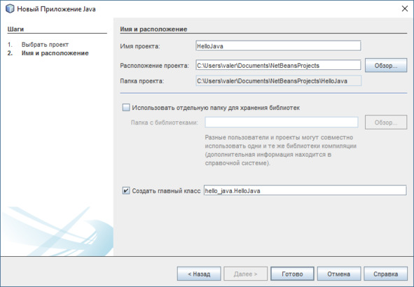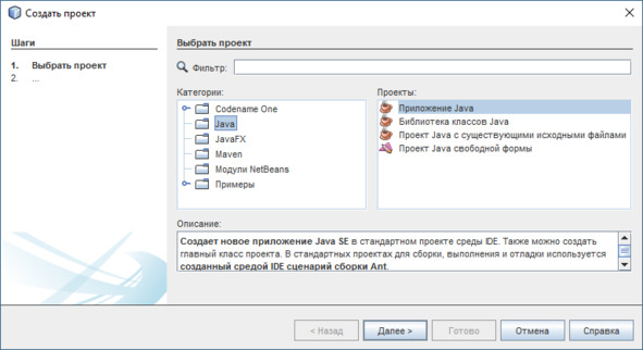 Запустите NetBeans. Выберите пункты меню Файл | Создать проект или нажмите на значок с изображением зеленой папки и символа «+». Выберите категорию Java и тип проекта Приложение Java (рис. 2.2). Введите имя нового проекта. Пусть это будет HelloJava (рис. 2.3).
