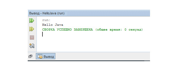 Запустите программу на выполнение, нажав значок зеленого треугольника или выбрав пункт меню Выполнить | Запустить проект. Спустя несколько секунд сборка проекта будет завершена. В нижней части интерфейса NetBeans откроется окно терминала, в который будет выведен текст «Hello Java» и сообщение об успешной сборке проекта (рис. 2.4).