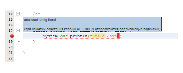 Попробуйте совершить ошибку в тексте программы и посмотрите, как отреагирует среда разработки. Удалите одну из кавычек, обрамляющих строку «Hello Java». Система контроля синтаксиса немедленно отреагирует на ошибку. Ближайшая круглая скобка будет выделена красным цветом (из-за отсутствующей кавычки эта скобка оказалась не на своем месте), а напротив строки, содержащей ошибку, появился восклицательный знак на красном фоне. Это обозначение критической ошибки, которая приведет к ошибке компиляции. При наведении указателя мыши на значок ошибки появляется всплывающая подсказка (рис. 2.5).