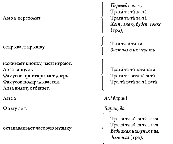 Это разбивает стих и создает в нем трещину. Однако бывают случаи, когда такие продолжительные остановки неизбежны по требованию самой пьесы, которая вклинивает в стих длинные, безмолвные действия. Вот, например, в первой сцене первого акта «Горя от ума» Лиза стучится в дверь спальни Софьи, чтоб прекратить затянувшееся до рассвета любовное свидание ее барышни с Молчалиным. Сцена идет так:
