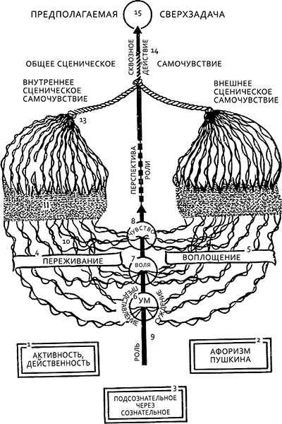 № 13. Это тот узел, в который завязываются все линии стремления двигателей психической жизни; это то душевное состояние, которое мы называем «внутренним сценическим самочувствием».
