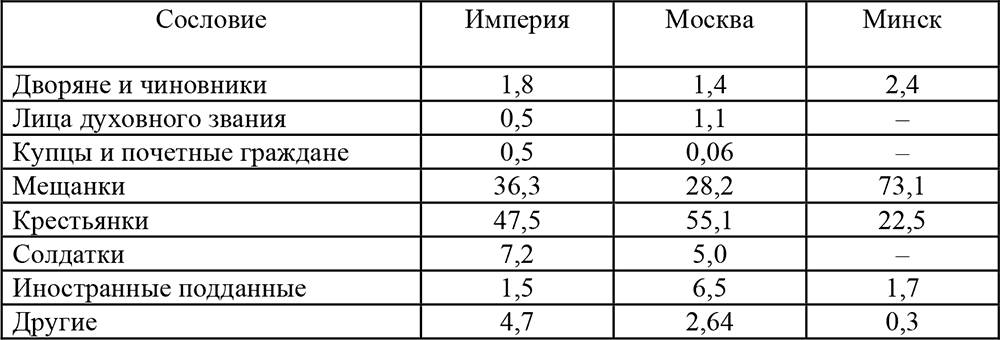 В целом по империи в этот период были распространены венерические заболевания, особенно сифилис.[59] Так, из общего количества лиц, занимающихся проституцией, в Минске являлись носителями венерических заболеваний 57,9 % (из них в домах терпимости – 61,3 %; занимающихся проституцией нелегально – 60,6 %). Аналогична и статистика этого периода по Москве. По средним показателям 1890 г. около 82,2 % женщин, занимающихся проституцией, являлись носителями венерических заболеваний.[60]