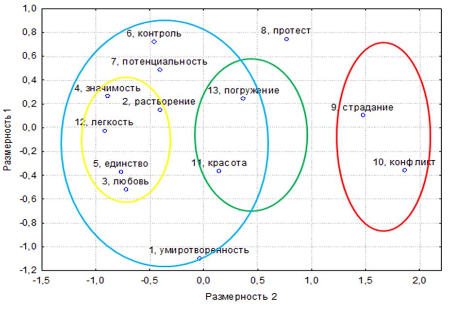 Многомерное шкалирование позволяет сделать и другие выводы. Если присмотреться к нашему рисунку, то снизу мы увидим переживания, которые можно охарактеризовать как «созерцание, покой». Вверху мы встретим переживания с общим смыслом «активное действие, сосредоточенность на цели».