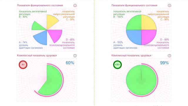 Посмотрите, как подобная настройка на глубокий отдых за десять минут переключает организм на прекрасное здоровье. Слева расположены диаграммы функционального состояния организма до десятиминутного отдыха. Справа – после отдыха с соответствующей настройкой. Показатели меняются на 39% до почти абсолютно идеального состояния. Синхронизируются и упорядочиваются биоритмы, возвращается оптимальный баланс нервных процессов возбуждения и торможения.
