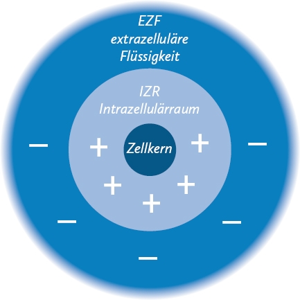 Die Zelle kann ihre lebenswichtigen Funktionen nur aufrechterhalten, weil sie polar aufgebaut ist. Durch die ungleiche Verteilung elektrischer Ladungen innerhalb und außerhalb der Zelle entsteht eine elektrische Spannung (Potenzialdifferenz) zwischen Zellinnerem und Zelläußerem. Durch den Ladungsunterschied zwischen der Innen- und Außenseite der Zellmembran entsteht das Ruhepotenzial, das beim Menschen zwischen -70 und -80 mV beträgt. Dabei ist die Innenseite der Zellmembran negativ, die Außenseite dagegen positiv geladen. Innerhalb der Zelle finden sich fast nur Kalium-Ionen (K+-Ionen), außerhalb der Zellmembran Natrium-Ionen (Na+-Ionen). Erst durch diesen Unterschied können lebenswichtige Stoffe in die Zelle hinein- und nicht mehr benötigte Stoffe hinaustransportiert werden. Nur so ist Leben möglich! Interessant ist, dass die jeweils anderen Ionen in geringer Menge ebenfalls vorhanden sind, vergleichbar zu den Punkten im Yin-Yang-Zeichen: Ein kleiner Teil Natrium-Ionen befindet sich auch im Zellinneren und ein kleiner Teil Kalium-Ionen im Zelläußeren. Die Spannungsveränderungen in Form elektrischer Impulse dienen der Informationsübertragung im gesamten Organismus.