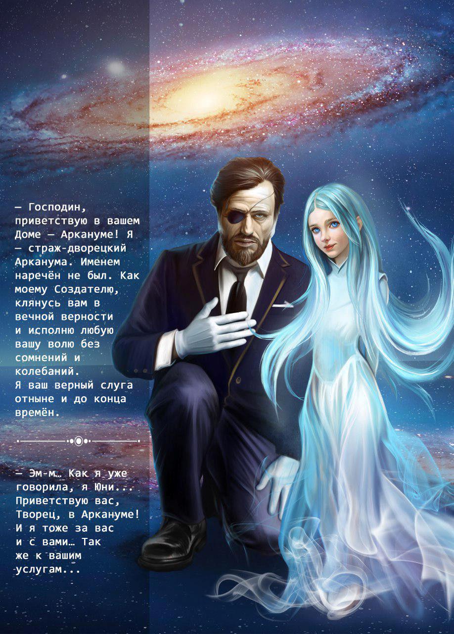«Мы – Иском – Сообщество Сознаний. Мы – часть тебя, а ты – частица нас, Сознание, кому выпала судьба стать Творцом. Мы твои родственники, помощники и проводники в нелегком деле творения миров. И, да, мы знаем, что у тебя сейчас много вопросов. Скоро ты получишь ответы, а также познакомишься с другими нашими Сознаниями, кому выпала честь лично помогать тебе. А сейчас тебя ждут Страж Арканума и его гостья Юни. Ответь достойно…»