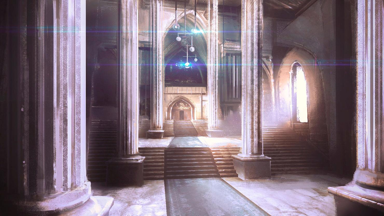 Как и ожидалось от дворца, меня встретил большой зал с очень высоким потолком, где висели простые, но прекрасные люстры, вместо лампочек или свеч горели яркие огоньки, эффектно освещая все вокруг. А по бокам в этом, уходящем вперед на много метров зале, чем-то напоминающем широченный коридор, возвышались, крепко держа потолок, массивные колонны. Показалось, что пол, стены и колонны были сделаны из светлого мрамора моего мира, но, очевидно, это был совсем другой материал, хоть и похожий.