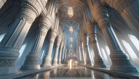 Как можно было ожидать, во дворце меня встретил большой зал с очень высоким потолком, где висели простые, но прекрасные люстры, вместо лампочек или свеч горели яркие огоньки, эффектно освещая все вокруг. А по бокам в этом уходящем на много метров вперед зале, чем-то напоминающем широченный коридор, возвышались массивные колонны. Показалось, что пол, стены и колонны были из светлого мрамора моего мира, но, очевидно, это был совсем другой материал.