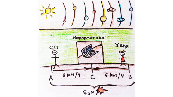 Первой в расписании стояла злополучная информатика, к которой она забыла приготовить доклад. Вероятно, в процессе строительства школы был ретроградный Меркурий, Венера в Скорпионе и Солнце в зените, потому что по роковому стечению обстоятельств до компьютерного класса можно было добраться двумя не связанными друг с другом маршрутами. Из точек А и Б в точку С навстречу друг другу со скоростью 6 км/ч с одной стороны спешила опаздывающая сонная Женя, с другой торопился на урок глубоко погруженный в себя учитель информатики Сергей Петрович. Как два корабля в открытом космосе, они мчались к заветной орбитальной станции, ничего и никого не замечая на своем пути. До столкновения оставалось: три, два, один… Бум!