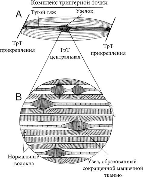 Центральные триггерные точки обычно находятся в брюшке мышцы: они появляются вследствие дисфункции двигательных концевых пластинок и располагаются вблизи центра мышечных волокон.