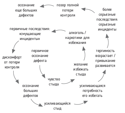 Автор описывает спираль стыда, включающую в себя в качестве защиты от него употребление ПАВ и другие формы зависимого поведения. Последовательно появляется первичное осознание дефекта – чувство стыда – желание избежать стыда – употребление ПАВ – последствия проступка – дискомфорт от потери контроля – осознание своей дефективности – усилившийся стыд – увеличившаяся потребность его избежать – рост толерантности и развитие зависимости – более серьезные проступки – позор полной потери контроля – осознание полной дефективности (рис. 2).