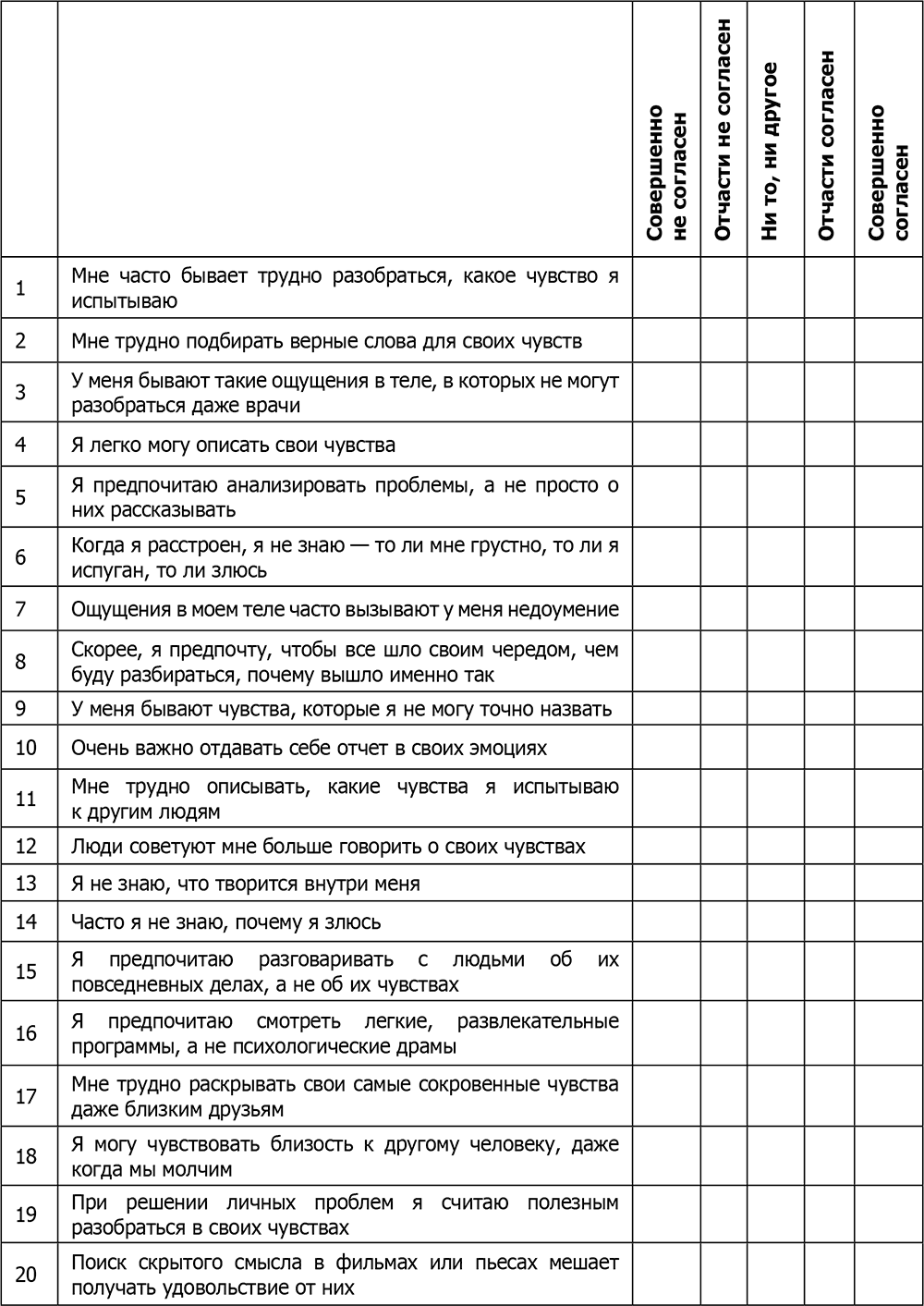 Для количественной оценки алекситимии чаще всего используется 20-пунктовая Торонтская шкала алекситимии (Toronto Alexithymia Scale, TAS-20), разработанная Майклом Бэгби с соавт. (Bagby M. et al., 1994) и адаптированная Старостиной Е. Г. с соавт., 2009.