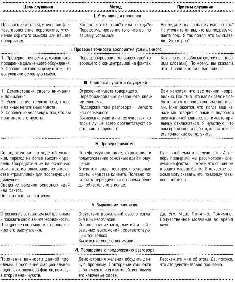 Активное слушание помогает сосредоточить внимание на клиенте, понять его и «разговорить». Оно отличается от пассивного слушания, применяемого в психоанализе, по следующим показателям (Сидоренко, 2008):
