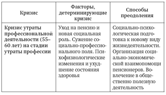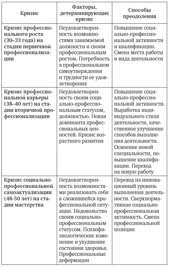 Противоречия между желаемой карьерой и ее реальными перспективами приводят к развитию кризиса профессиональной карьеры. Продуктивный выход из него – новаторство, изобретательство, стремительная карьера, социальная и профессиональная сверхнормативная активность. Деструктивные варианты разрешения кризиса – увольнение, конфликты, профессиональный цинизм, алкоголизм, создание новой семьи, депрессия.