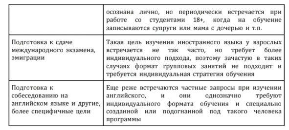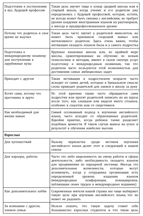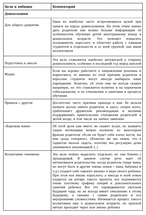 И вот мы плавно подошли к тому, какие же цели преследуют студенты и (или) их родители, когда обращаются в языковую школу и хотят записаться на ваши курсы (табл. 2). Это те амбиции, которые родители озвучивают, а также скрытые, которые удается выяснить или понять в ходе грамотной беседы (дело в том, что родители не всегда готовы произнести вслух некоторые вещи, о которых мы будем говорить ниже).