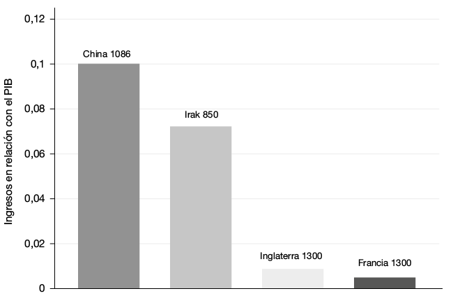 Para ver cuál era la debilidad inicial de Europa, fijémonos en los datos de la figura 1.1, que muestra una estimación de los ingresos estatales como parte de la producción económica total en cuatro sociedades: China con la dinastía Song en el 1086 d. C., Irak con el califato abasí en el 850 d. C. y, por último, Inglaterra y Francia sobre 1300 d. C.23 Los emperadores Song y los califas abasíes pudieron extraer unos ingresos en relación con el PIB diez veces mayores que los gobernantes europeos. Estas cifras corresponden a los impuestos centrales; la cuestión de los impuestos locales europeos, y en particular la de los diezmos que fueron destinados a la Iglesia, se abordará en el capítulo v y no afectará a mi conclusión general.