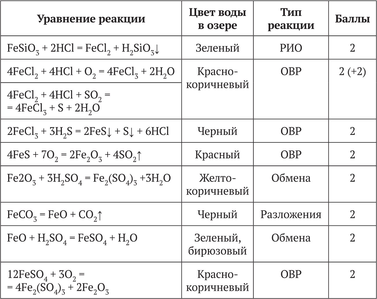 Каждое верное уравнение реакции оценивается в 1 балл, указание типа химической реакции также оценивается в 1 балл. Таким образом, каждая команда может максимально набрать 14 баллов. Дополнительные баллы начисляются при условии написания нескольких верных уравнений реакций, приводящих к веществу, указанному в цепочке. Побеждает команда, набравшая максимальное количество баллов. Команда экспертов в соревновании не участвует.