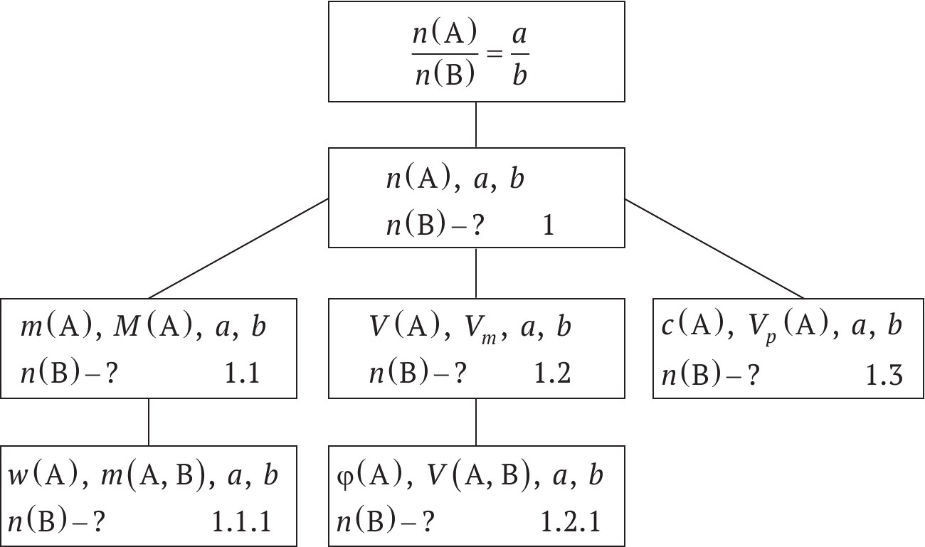 На схеме представлены логико-математические структуры задач, в условиях которых вместо прямого задания величин центрального отношения заданы величины, позволяющие их вычислить. Например, в задаче 1.1 количество вещества A, т.е. n(A), задано через массу двухкомпонентной системы m(A, B) и массовую долю вещества A, т.е. w(A). При построении схем, отображающих поля логико-математических структур расчетных задач, учащиеся осваивают способ и знаковые инструменты моделирования. Последующая работа включает как самостоятельное составление задач по схемам, так и составление логико-математических схем задач, которые предложены для решения.