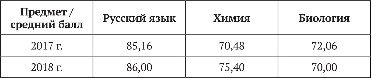 Эти показатели значительно выше средних баллов учащихся Краснодара, Краснодарского края и в целом по России. Так, по данным официального сайта ЕГЭ [4], средний балл выполнения экзаменационной работы по химии в 2018 г. составил 55,1 балла (в 2017 г. – 55,2), по биологии – 51,4 (в 2017 г. – 52,57).