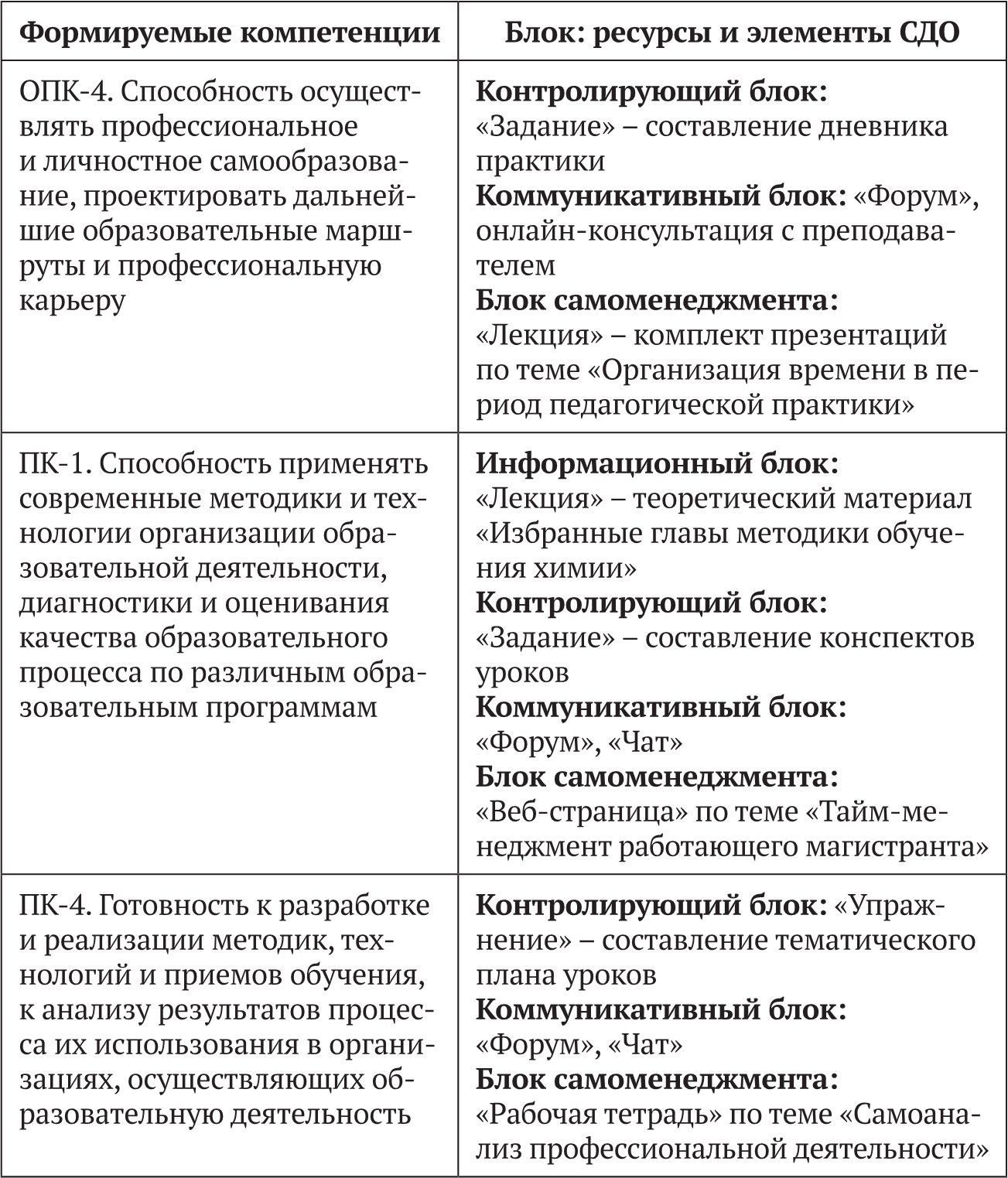 Комплекс средств, размещенный на образовательном портале, включает следующие блоки: информационный, тренирующий, контролирующий, коммуникативный, а также блок самоменеджмента. В табл. 1 приведены примеры использования блоков дистанционной поддержки и соответствующих им ресурсов СДО для формирования компетенций магистрантов в ходе прохождения педагогической практики.