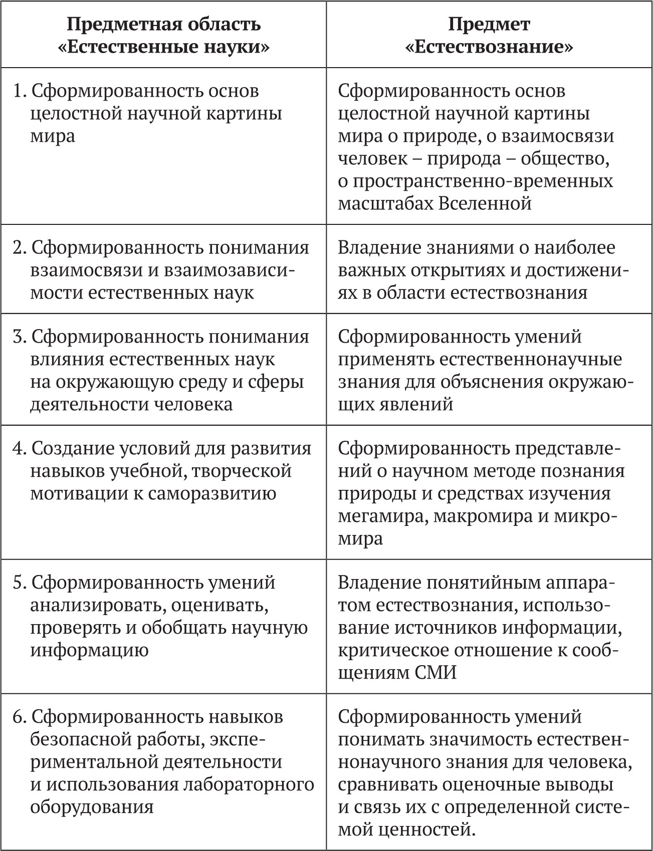 Обращает на себя внимание (табл. 1), что рекомендации ФГОС носят «рамочный» характер. Они не содержат обязательного образовательного минимума по конкретным наукам: физике, химии, биологии. ФГОС регламентирует не содержание обучения, а только планируемые результаты. Предлагаемый ФГОС интегрированный предмет «Естествознание» не решает задачи естественнонаучной подготовки, поэтому школьная дисциплина «Естествознание» не может заменить ни один предмет школьного естественнонаучного цикла. «Естествознание» – интегрированная школьная дисциплина, основная цель которой – формирование целостного представления об окружающем мире. Как видно из сравнения, предметные результаты [3] ориентированы преимущественно на общеобразовательную и общекультурную подготовку.