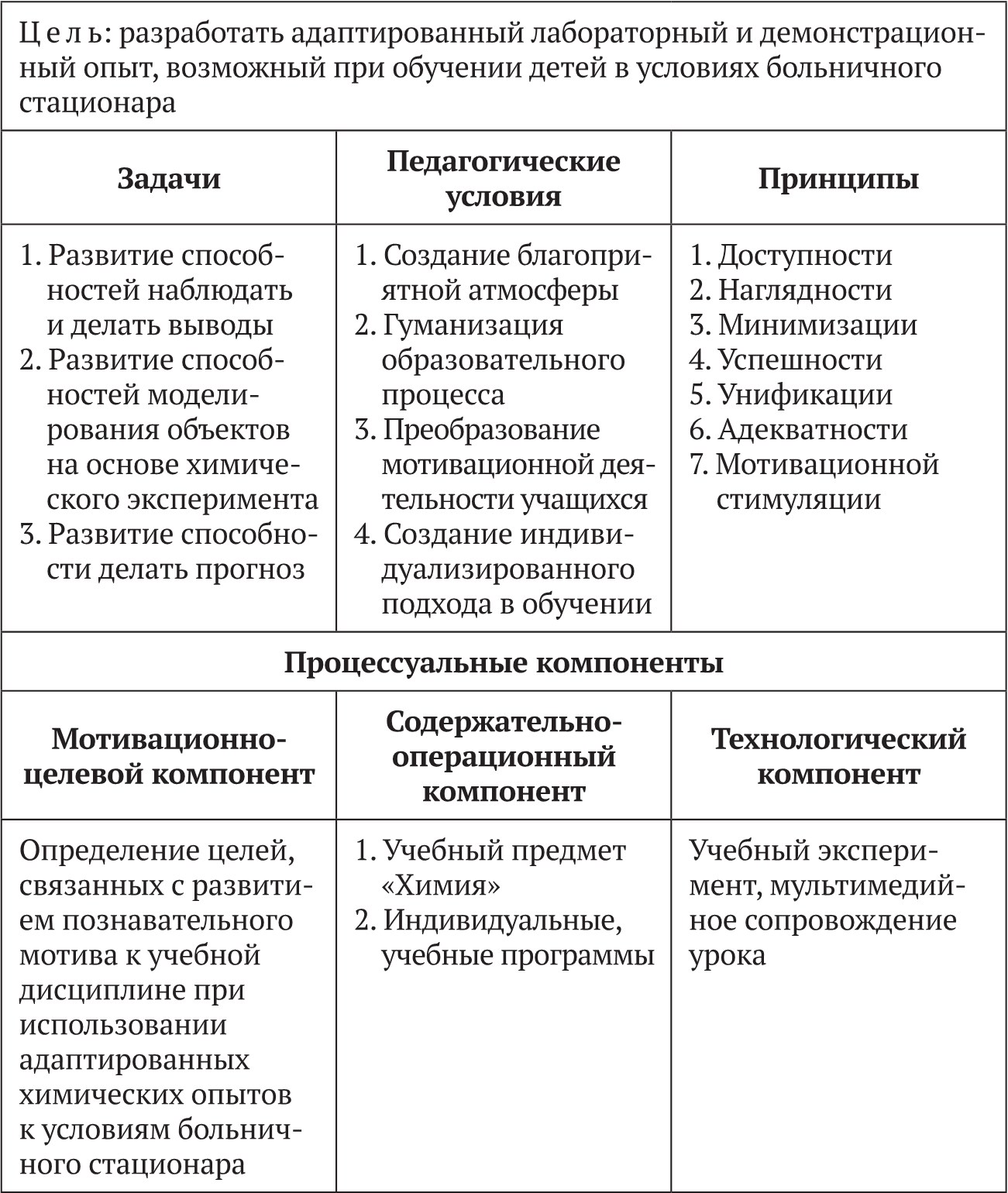 Исходя из всего вышесказанного, те принципы, методы и формы, которые применяются в школе, не могут быть применены в процессе обучения детей в условиях больничного стационара. Поэтому существует проблема разработки процесса обучения химии с использованием химических опытов, приспособленных к условиям больничного стационара (табл. 1).