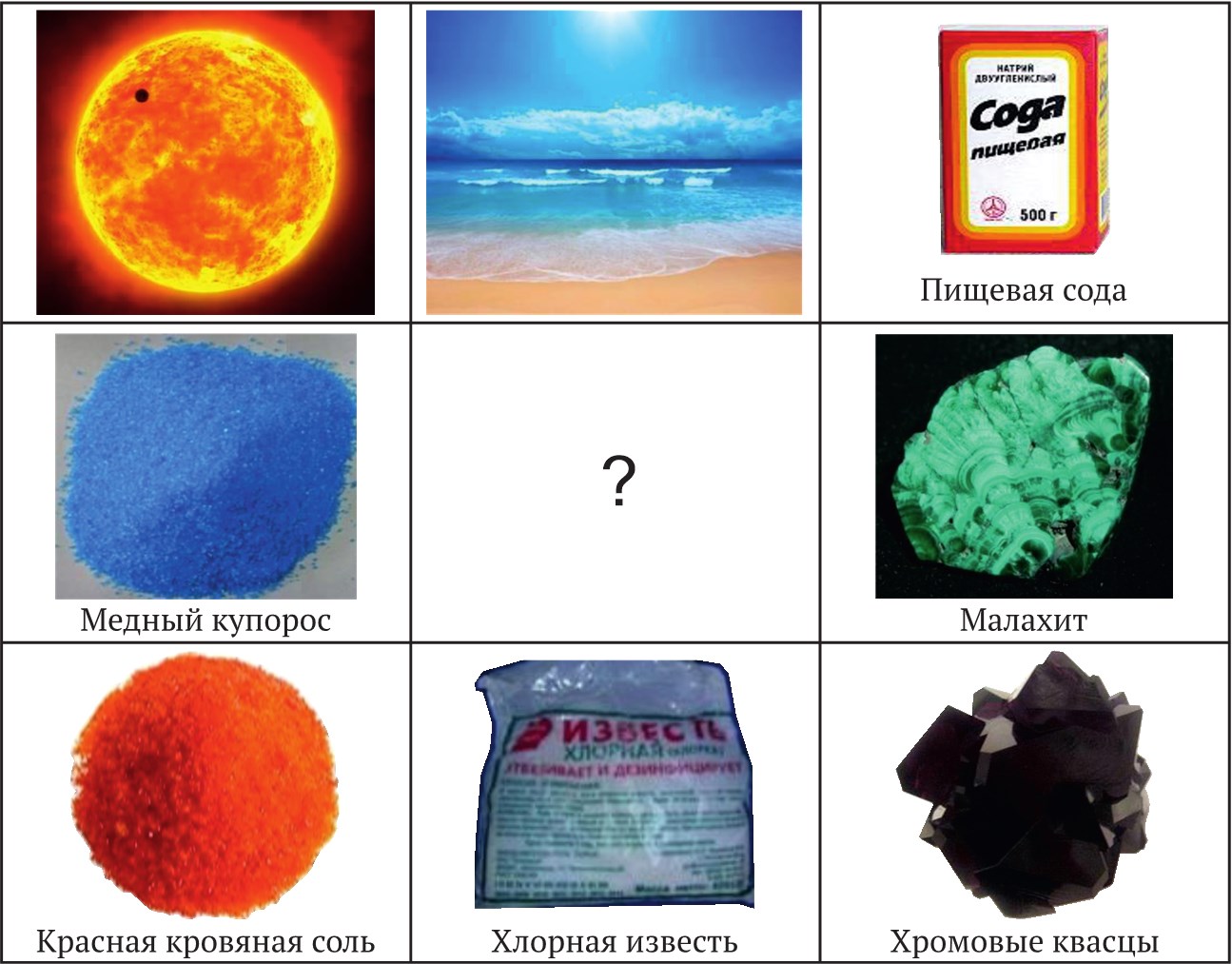 1. Солонь – древнее название Солнца. 2. Море – из него до сих пор добывают соль. 3. Кислая соль – пищевая сода – NaHCO3. 4. Основная соль – малахит – CuCO3·Cu(OH)2. 5. Двойная соль – хромовые квасцы – KCr(SO4)2·12H2O. 6. Смешанная соль – хлорная известь – Ca(Cl)OCl. 7. Комплексная соль – красная кровяная соль – K3[Fe(CN)6]. 8. Кристаллогидрат – медный купорос – CuSO4·5H2O.
