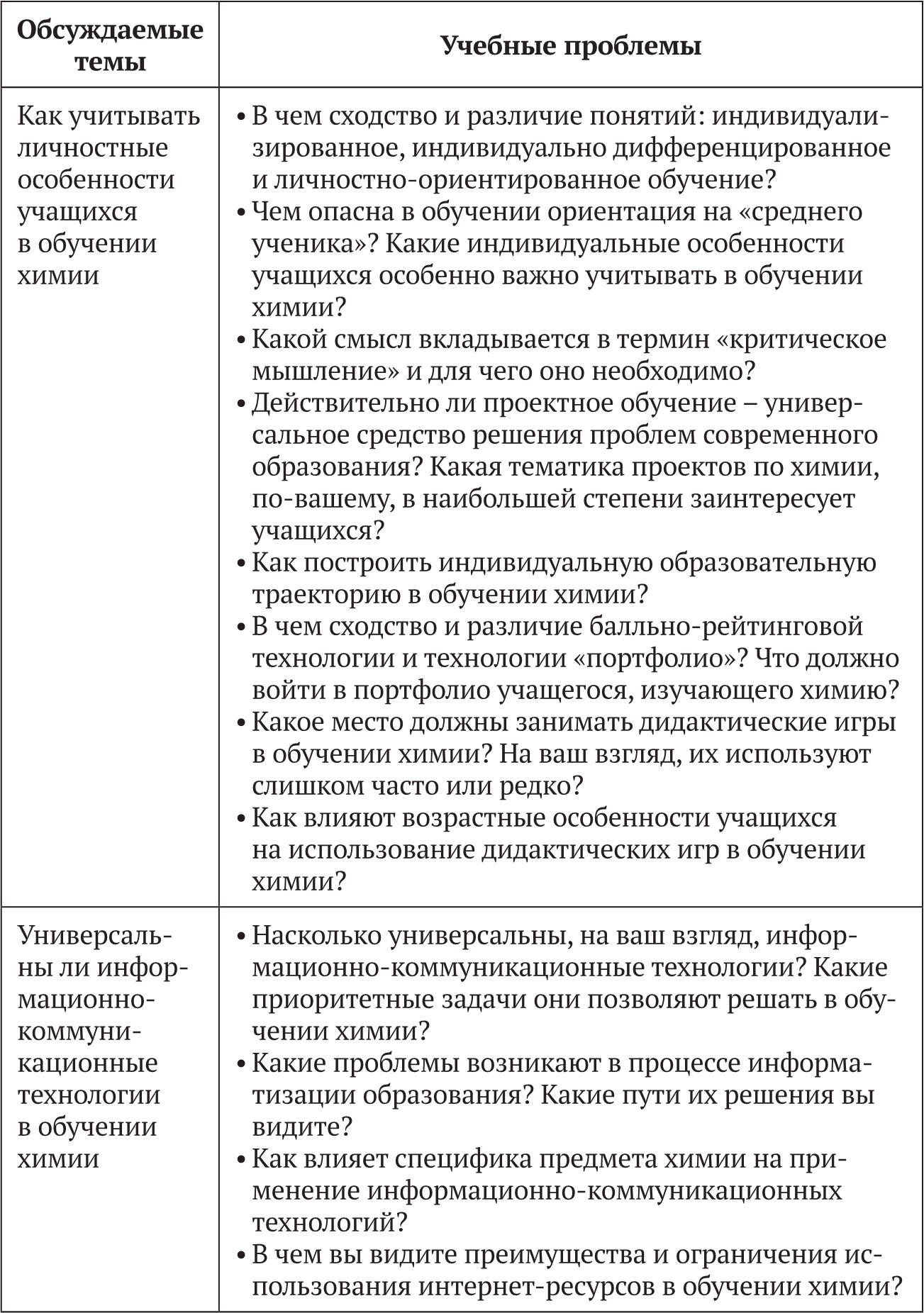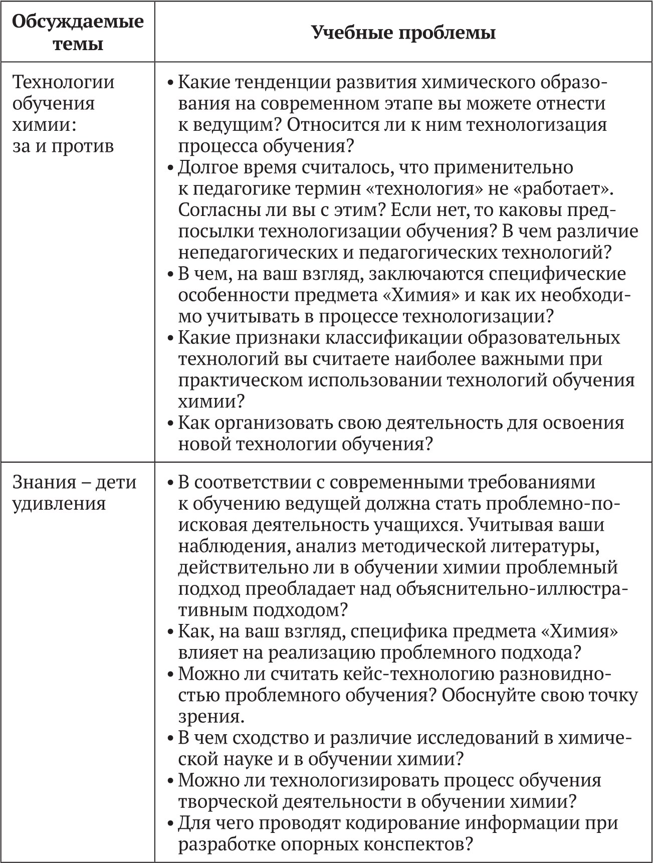 Выбор тем для обсуждения (табл. 1) определяется целями и задачами образовательной программы, содержанием учебной дисциплины, ее ролью в процессе подготовки учителя.