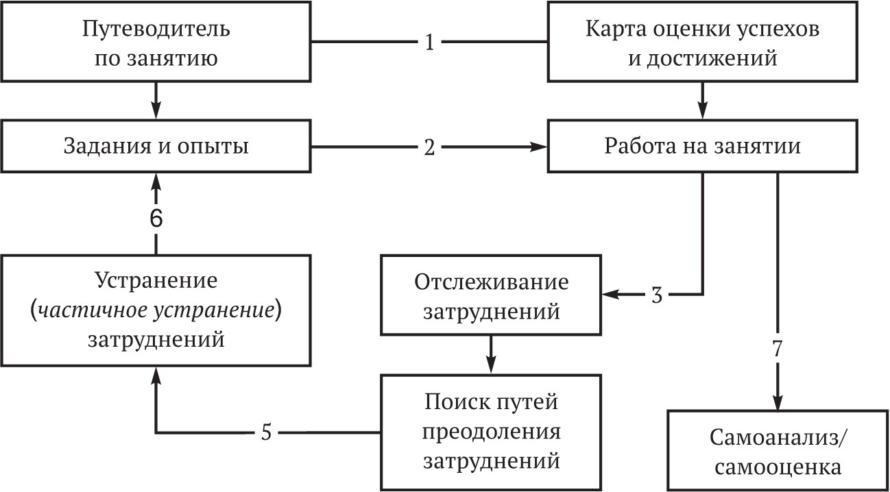 После выявления возможных затруднений учащиеся приступают к поиску путей устранения/преодоления возникших затруднений (4), используя все имеющиеся ресурсы и возможности: задают вопросы друг другу / учителю, используют материалы учебника и дополнительных источников, собственных конспектов по рассматриваемой теме. Если учащийся, работая над конкретным затруднением, нашел способ его устранения, он выполняет упражнение с большей долей уверенности и понимания собственных действий и с бóльшим процентом правильности. Таким образом, поиск путей преодоления возникающих затруднений и их успешное применение приводят к устранению (или частичному устранению) выявленных затруднений (5).