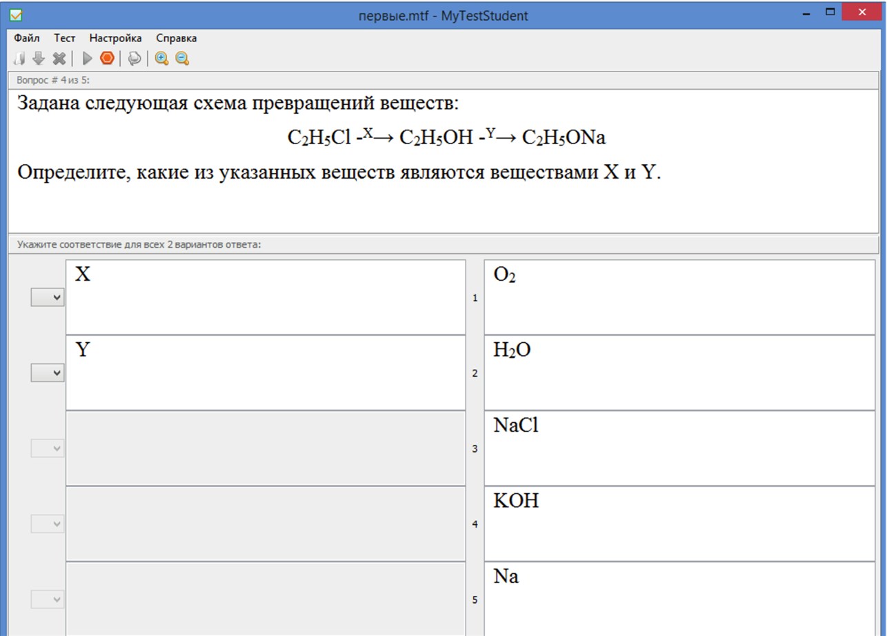 Для создания компьютерных тестов нами выбрана программа MyTestX, так как она обладает большими возможностями для разработки и проведения компьютерного тестирования [4]. Программа является свободно распространяемой, поддерживает большое количество графических форматов, включает редактор формул. Нами разработана компьютерная база тестирования, включающая в себя вопросы по основным разделам химии. Она представлена заданиями различных типов: множественный выбор, сопоставление, ручной ввод числа, реализованных в программе MyTestX (рис. 1, 2).