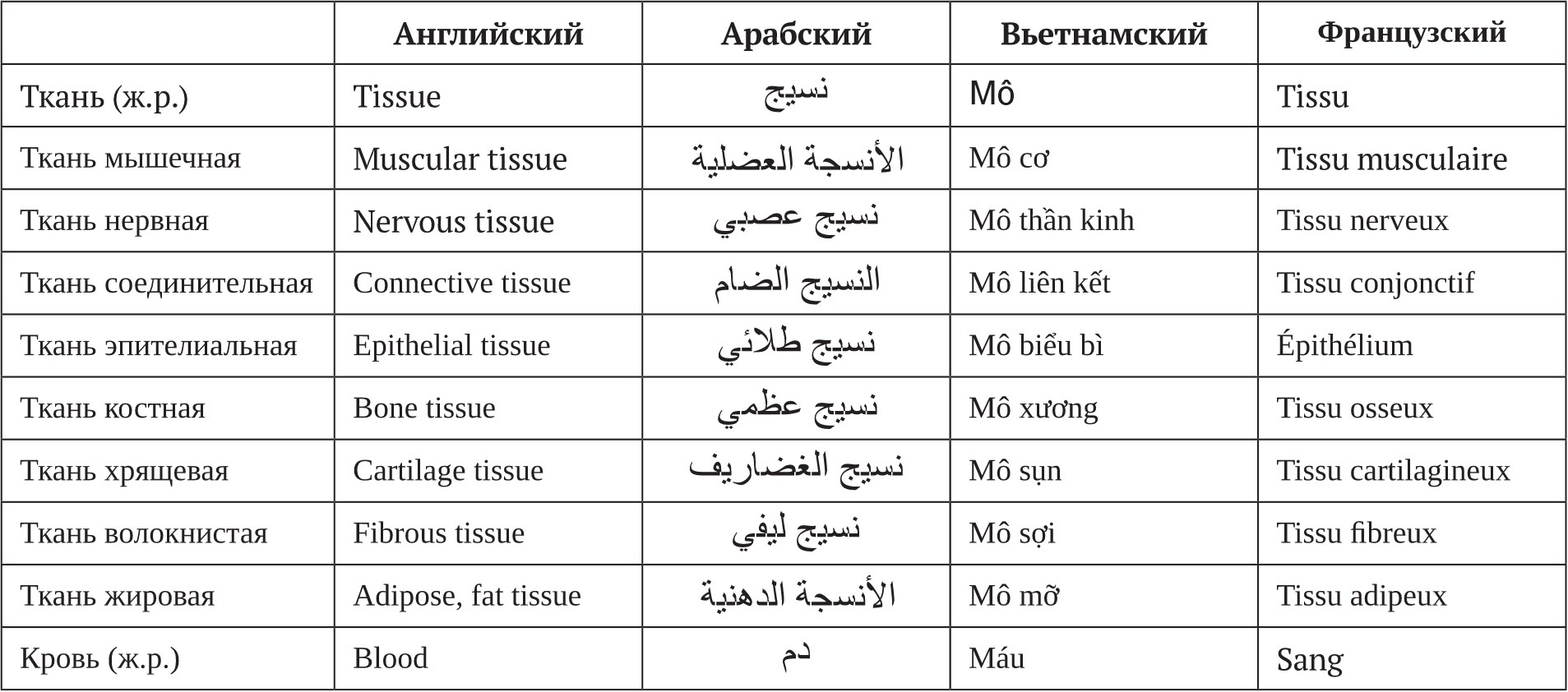 Одним из достоинств данного словаря является расставленное ударение во всех русскоязычных терминах, что ориентирует внимание студентов на правильность произношения русских химических терминов в их устной речи, в частности при пересказе содержания той или иной темы химического пособия и при устном ответе на вопросы преподавателя. Наша практика работы с таким словарем, который в настоящее время входит в состав учебных пособий по химии, показала повышение успеваемости студентов и более активное, эффективное и ускоренное изучение курсов органической и неорганической химии в нашем вузе. Следует особо отметить среди предметных словарей для иностранных студентов также и «Краткий русско-англо-вьетнамо-французский словарь биологических терминов» [7], созданный нами для студентов, изучающих биологию (раздел «Анатомия и физиология человека»). Словарь содержит 350 слов и словосочетаний на русском языке с переводом их на три языка: английский, вьетнамский и французский. Словарь состоит из двух разделов: в первом разделе слова и словосочетания представлены в порядке их появления в тексте пособия, во втором – строго по алфавиту. Ниже приводится краткие фрагменты из первого и второго разделов (рис. 2, 3).