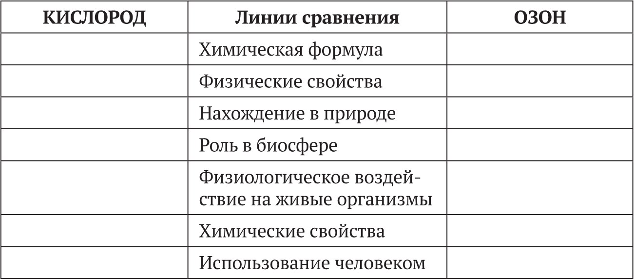 При знакомстве с явлением аллотропии на примере аллотропных видоизменений кислорода в качестве самостоятельной работы обучающимся может быть предложено заполнение концептуальной таблицы с использованием текста параграфа учебника.
