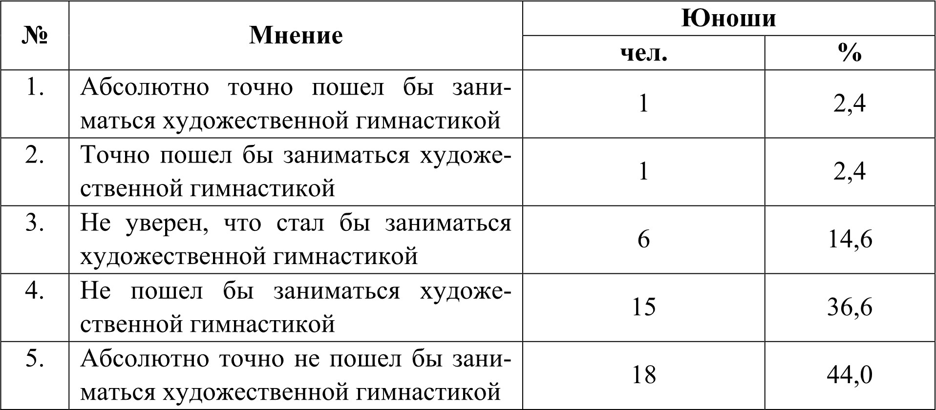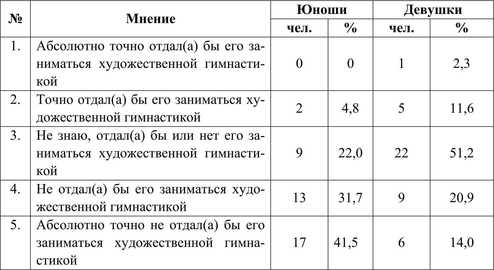 Если сравнивать ответы юношей и девушек, из полученных данных видно, что среди юношей больше удельный вес тех, кто настроен категорически против и, наоборот, меньше доля тех, кто пока не принял решение о допуске своего будущего сына к занятиям художественной гимнастикой.