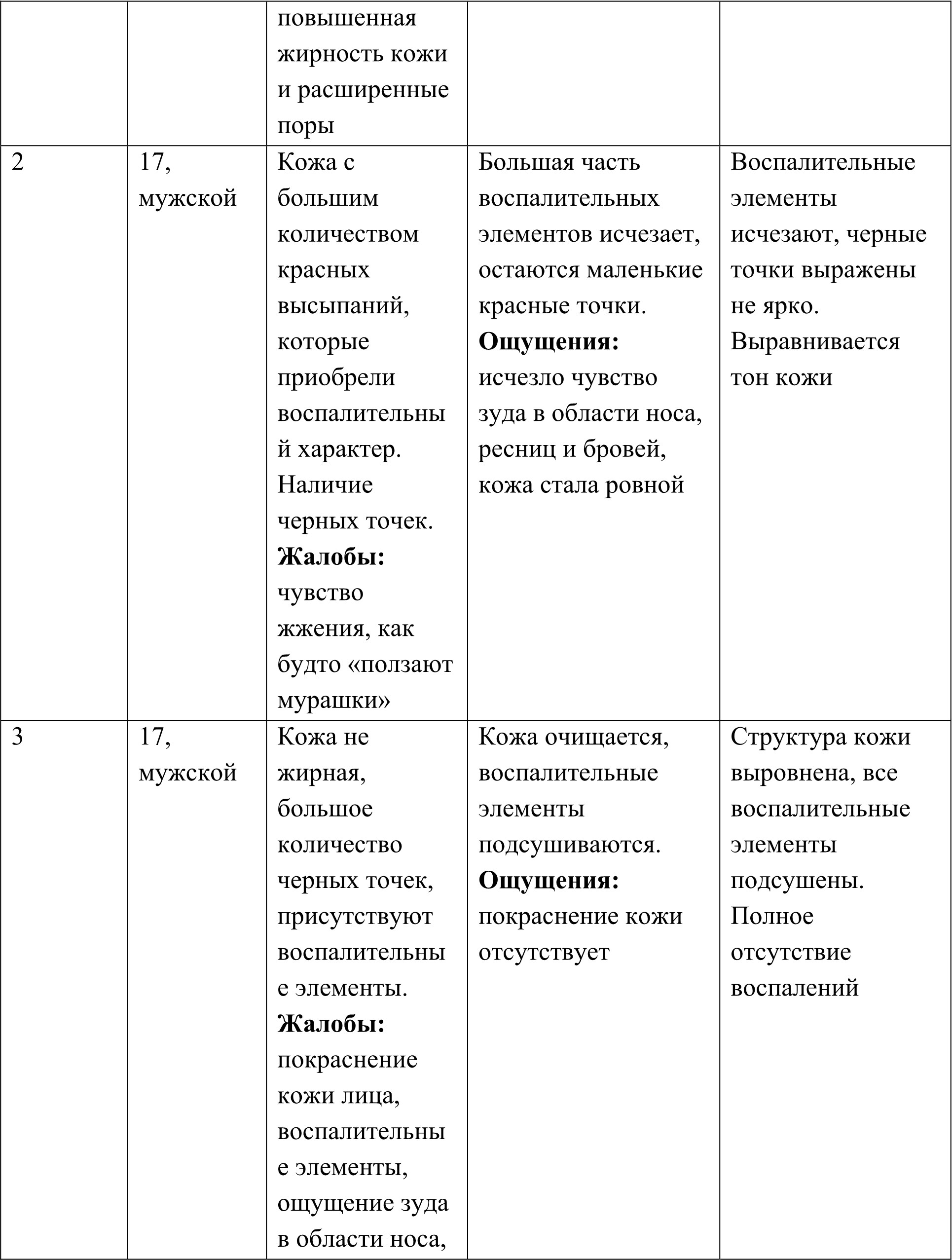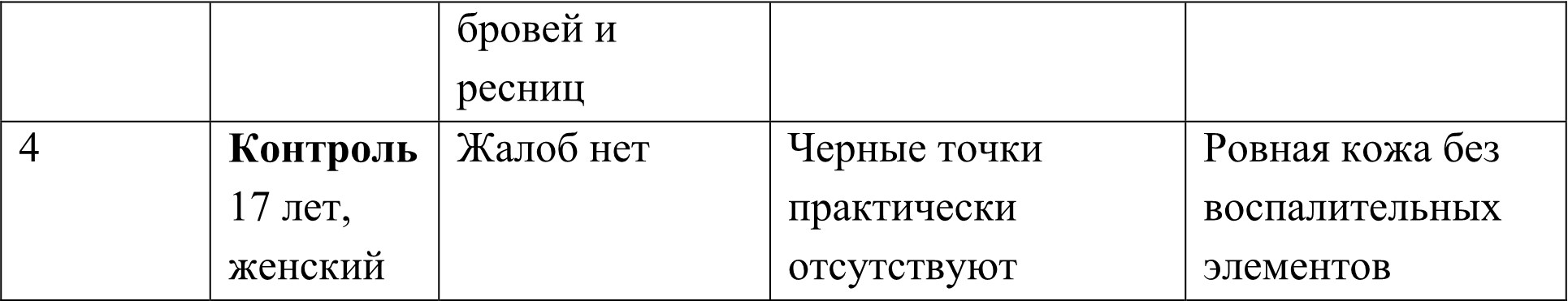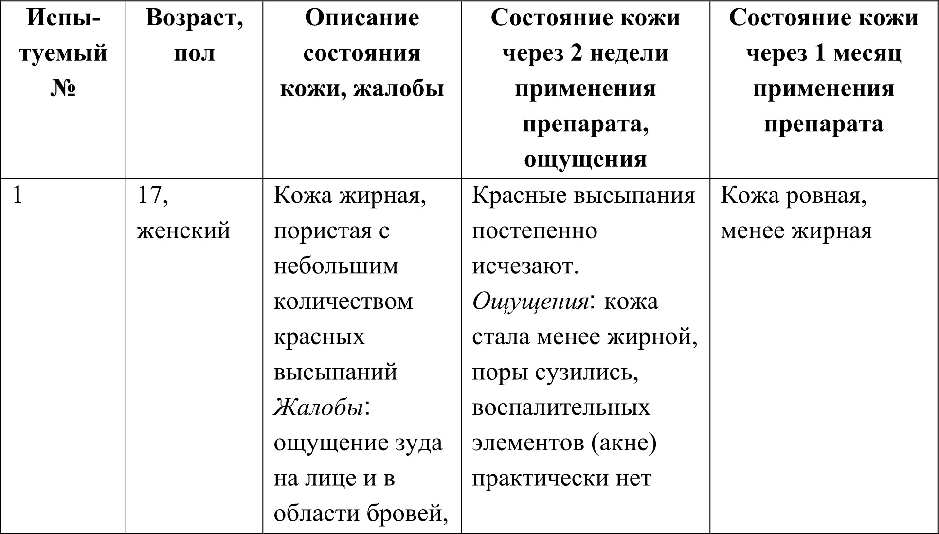 5. Для проверки эффективности выработанного средства было исследовано четыре человека (по желанию) с учетом их жалоб на состояние кожи. Один из них был контрольным, то есть использовал только травяные настои для умывания. Составлена сводная таблица (см. таблицу), сделан вывод об эффективности выбранного метода борьбы с розацеа.