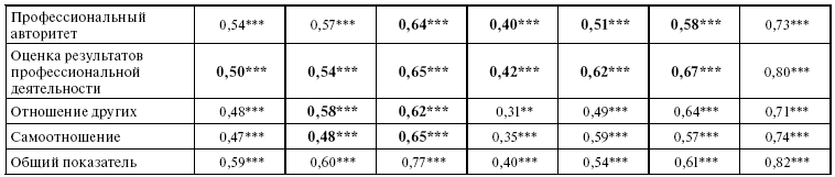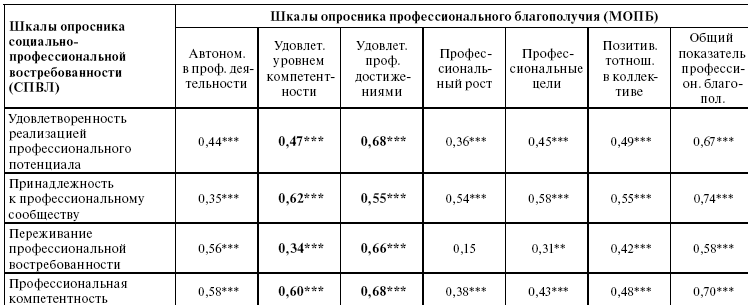 Примечание: ** – р≤0,01; *** – р≤0,001; см. объяснение выделенных полужирным значений коэффициентов корреляции в тексте; сокращенные обозначения шкал опросника МОПБ: Автоном. в проф. деятельности – Автономность в профессиональной деятельности; Удовлет. уровнем компетентности – «Удовлетворенность уровнем компетентности»; Удовлет. проф. достижениями – «Удовлетворенность профессиональными достижениями»; Позитив, отнош. в коллективе – «Позитивные отношения в коллективе»; Общий показатель профессион. благопол. – «Общий показатель профессионального благополучия».
