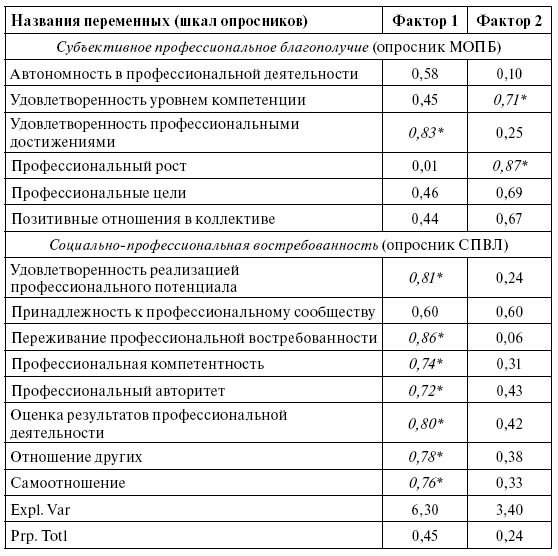 Результаты факторного анализа. Следующий шаг анализа полученных данных в выяснении того, являются ли тесно связанные оценки профессионального благополучия и оценки социально-профессиональной востребованности независимыми психологическими образованиями. Для ответа на этот вопрос был проведен факторный анализ. Была выбрана двухфакторная модель, объяснявшая 69 % дисперсии данных. Для содержательной интерпретации выделенных факторов использовались переменные с факторным весом >0,70. В качестве переменных рассматривались шкалы опросников МОПБ и СПВЛ (таблица 2).