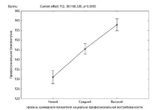 Результаты однофакторного дисперсионного анализа позволили предположить, что оценки оперативным персоналом своей социально-профессиональной востребованности оказывают влияние на субъективное профессиональное благополучие оперативного персонала: чем выше оценивается социально-профессиональная востребованность, тем ближе переживание профессионального благополучия к оптимальному состоянию.