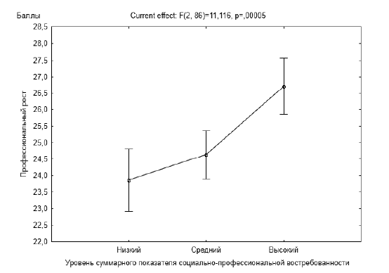 Результаты дисперсионного анализа (ANOVA). Последующий шаг анализа полученных данных состоял в изучении возможного влияния уровня социально-профессиональной востребованности на выраженность субъективного профессионального благополучия оперативного персонала АЭС. При проведении ANOVA независимой переменной служил суммарный показатель опросника СПВЛ. С помощью метода процентилей обследованная выборка сотрудников оперативного персонала АЭС была разбита на 3 группы с низким (менее 33-го процентиля), средним (от 33-го до 67-го процентиля) и высоким (более 67-го процентиля) уровнем суммарного показателя опросника СПВЛ. Зависимыми переменными служили: суммарный показатель и показатели каждой шкалы опросника профессионального благополучия (МОПБ). По данным ANOVA, установлена прямая зависимость как суммарного показателя (рисунок 1), так и показателей отдельных шкал опросника МОПБ от уровня суммарного показателя опросника СПВЛ. В качестве примера зависимости показателей отдельных шкал опросника МОПБ от уровня суммарного показателя опросника СПВЛ на рисунке 2 представлены данные ANOVA о зависимости показателя шкалы «Профессиональный рост» опросника МОПБ от уровня суммарного показателя опросника СПВЛ.