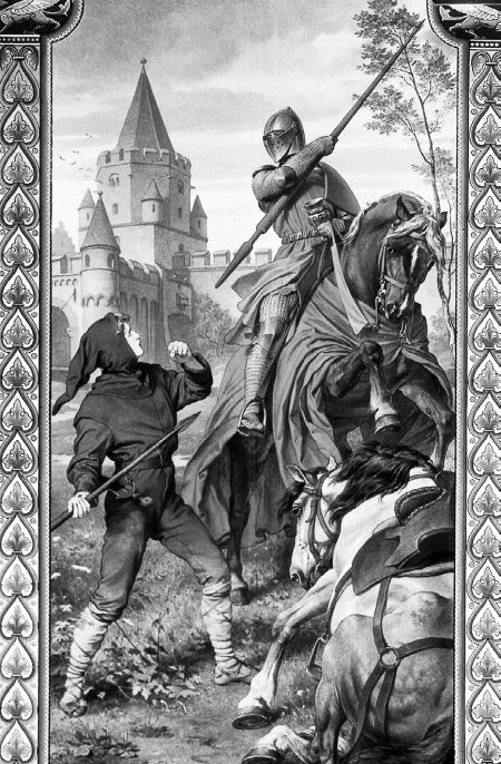 На одной из сцен изображен момент неожиданной встречи Парсифаля с двумя рыцарями, случайно проезжавшими через лес. До чего же странными показались они ему! Одетые в смешные блестящие доспехи, они вели разговор на непонятную тему… Но вместе с тем в них было что-то удивительно знакомое, что-то необъяснимое и влекущее. Парсифаль еще не знал, кто такие рыцари, но уже знал, что должен стать рыцарем сам.