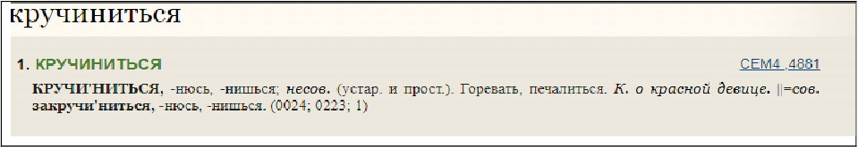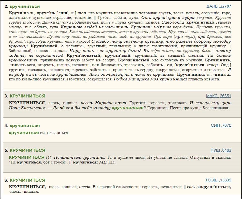 Другим ресурсом, содержащем онлайн-словари, который весьма успешно можно использовать при обучении иностранных студентов анализу художественного текста, является сайт Словари.ру – совместный проект Института русского языка им. В.В. Виноградова Российской академии наук и компании «Словари.ру» [5]. В настоящий момент он содержит 21 том лингвистических словарей, представленных в интерактивном режиме. Среди них толковые словари (МАС, словарь В.И. Даля, словари иностранных слов), Русский семантический словарь, Словарь русских личных имен, Словарь русских синонимов и сходных по смыслу выражений, а также представляющие особый интерес для развития умения понимать и верно интерпретировать русский художественный текст словари языка писателей (Словарь языка Пушкина, Словарь эпитетов Бунина, словарь языка Достоевского, Словарь неологизмов Северянина, а также Словарь поэтических цитат). Отличительной инструментальной особенностью данного сайта является возможность осуществлять поиск слова по всем представленным словарям одновременно либо выбрать интересующие словари и получить в одном месте все результаты поискового запроса. К примеру, на рис. 1 представлены результаты по запросу слова «кручиниться», которое вполне может встретиться при чтении художественного текста, при этом оно не является частотным и далеко не во всех языках имеет адекватные переводы.