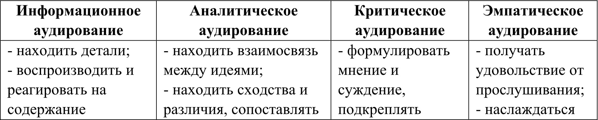 Нетрудно согласиться, что успешность обучения в целом зависит от хорошо сформированных навыков аудирования. Приведём примеры умений и навыков, необходимых для смысловой переработки информации в зависимости от вида аудирования [8]; [9] (см. Таблицу 1).