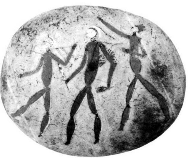 Как же выглядели творцы древних изображений? Мы знакомы с бесчисленным количеством разнообразных и замечательных произведений, обладаем знаниями о навыках и приемах работы их создателей, но у нас есть лишь единичные «портреты» предполагаемых художников. Среди таких уникальнейших свидетельств – камень, обнаруженный в 1911 г. при раскопках в пещере Колдстрим, Южная Африка, на котором красным, белым и черным нарисованы три антропоморфных персонажа. Изображенный в центре в одной руке держит каменную палитру, а в другой сжимает заостренное перо – таким инструментом наносили тонкие красочные линии.