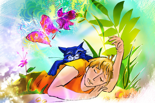 Львёнок прилёг на траву. Она оказалась такой мягкой, что никакая перина не смогла бы сравниться с ней. Львёнку стало уютно, ему показалось, что он никогда не покидал этой чудной Лужайки, а жил здесь всегда. Только смутное ощущение чего-то отсутствующего не покидало Львёнка. То есть даже не «отсутствующего», а «отсутствия присутствия», ― если бы было ещё что-то или кто-то, было бы совсем-совсем хорошо. Но тем не менее Львёнку ещё никогда в жизни не было так уютно и спокойно. Словно после долгого утомительного путешествия возвращаешься домой и ложишься отдыхать в знакомую, удобную кровать.