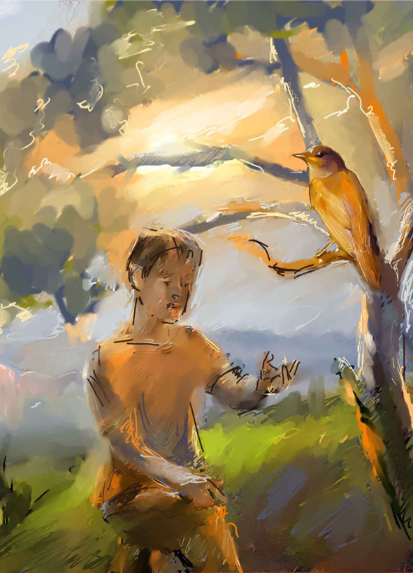 Подойдя к старому дубу, Львёнок постучал по нему. На стук из дупла вылетел соловей в золотистом оперении и с бабочкой на шейке.