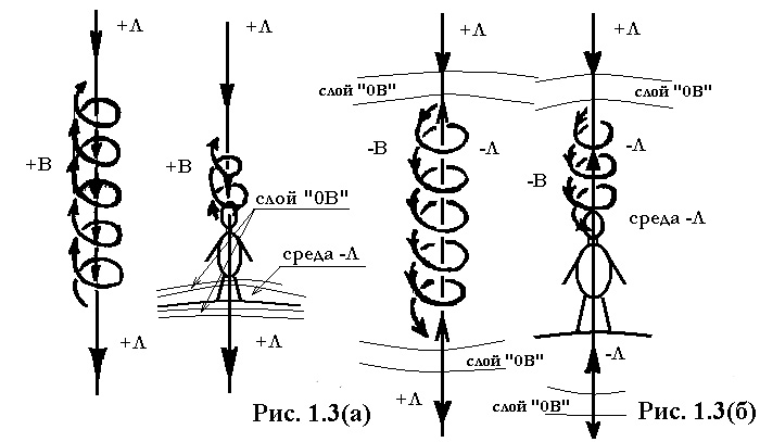 Если энергия «В» движется навстречу потоку Небесного Света (космическая энергия «Л») так, что энергия «Л», текущая внутри спирали «В», по направлению (по волновым характеристикам) совпадает с потоком Небесного Света, то мы этой энергии света присваиваем знак «плюс». А если энергия «В» вызывает движение энергии «Л» не совпадающее с потоком Небесного Света, то получает знак «минус» (см. рис. 1.3 а и б).
