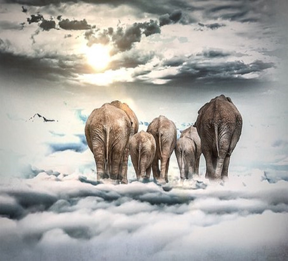 Но однажды Катя, закрыв глаза, засыпая, увидела огромного слона. Он встал на колени, приглашая ее: