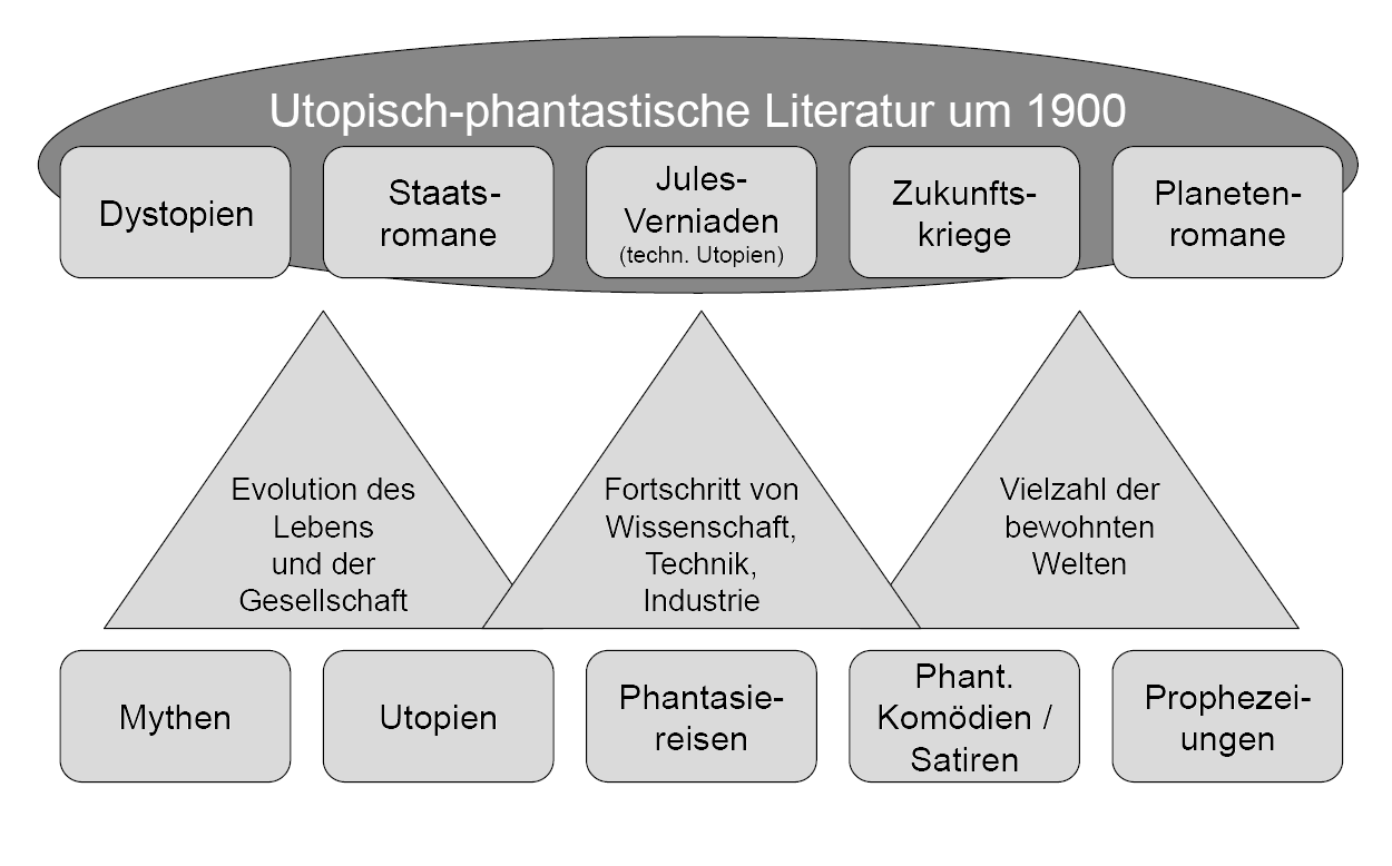 Vielleicht sollte man sogar von Paradigmenwechsel in der SF sprechen. Kurd Laßwitz konnte noch von einer »ethischen Kraft des Technischen« [Laßwitz, S. 437] ausgehen und wie Jules Verne davon träumen, daß der wissenschaftliche Fortschritt einen Fortschritt im Humanen nach sich zöge. Die SF hat in der Mehrheit ihrer Werke etwa ab dem Ersten Weltkrieg diesem Optimismus abgeschworen. Doch dieser Paradigmenwechsel – oder Wechsel in der Wertung – ändert nichts daran, daß die SF heute wie in ihrer Entstehungszeit, dem neunzehnten Jahrhundert, den Anschein der Wirklichkeitsnähe von drei fundamentalen weltanschaulichen Ideen herleitet: der Überzeugung vom unaufhaltsamen Fortschritt von Wissenschaft und Technik, dem auf Natur und Gesellschaft angewandten Entwicklungsgedanken und der Vorstellung von der Vielzahl der bewohnten Welten.