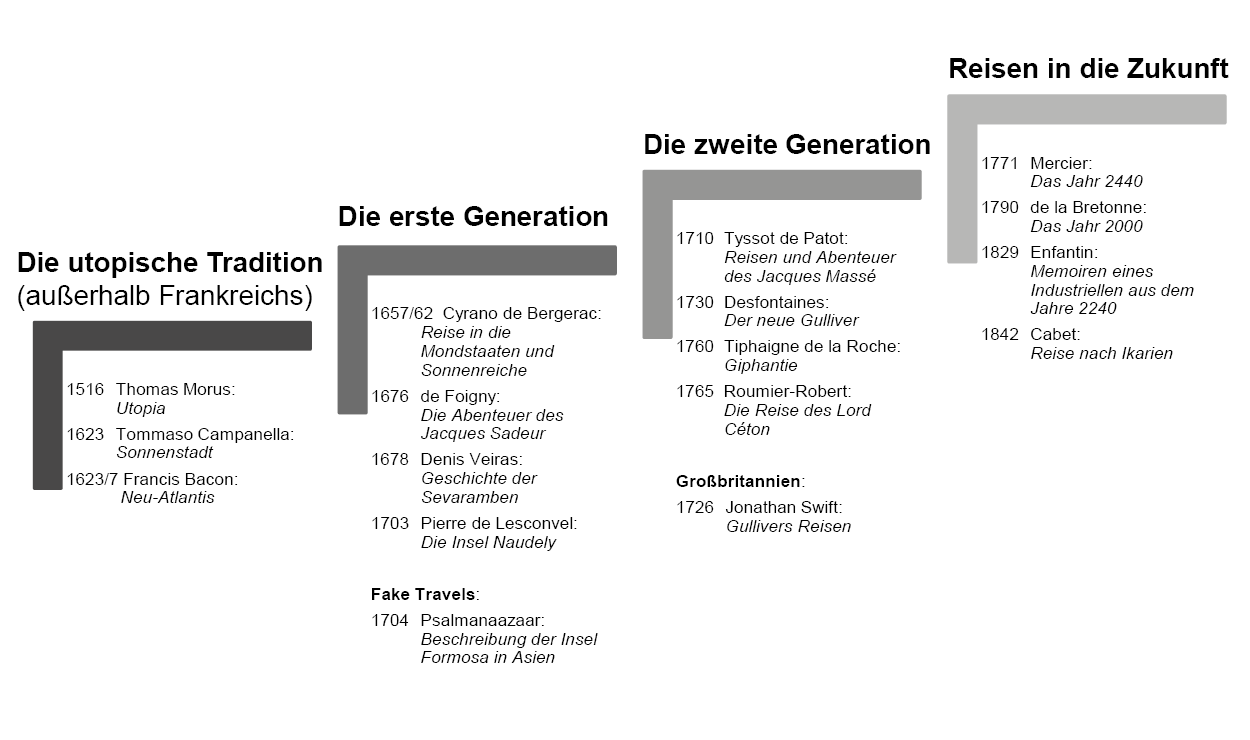 Beide, die Reise-Utopie wie die Robinsonade, stammen vom mittelalterlichen phantastischen Reiseroman ab, dessen Wurzeln bis in die Antike zurückgehen. Während die Utopie eine ideale Gesellschaft vorführt, zeigt die Robinsonade quasi als Gegenstück, welche positiven Kräfte im Individuum stecken, sobald es von den Einengungen durch Tradition und Intoleranz, von den Zwängen einer Ständegesellschaft und der Königsherrschaft befreit ist. Der Weg nach Utopia beginnt meist wie die Robinsonade mit einer nautischen Katastrophe – wenn man nicht gerade zum Mond oder wie bei Restif mit Dädalus-Flügeln unterwegs ist. Man muß eben in der Realität Schiffbruch erleiden, um in das Reich der Utopien zu gelangen.