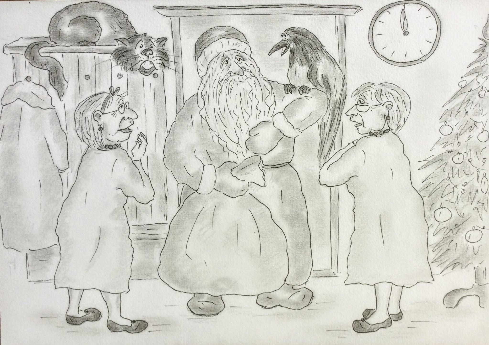 На пороге стоял самый настоящий Дед Мороз!! В шубе, шапке и варежках, с длинной бородой и с большущим мешком. А на плече у него сидела… Ворона! Баба Гуся и Тетя Маша от удивления и радости потеряли дар речи.