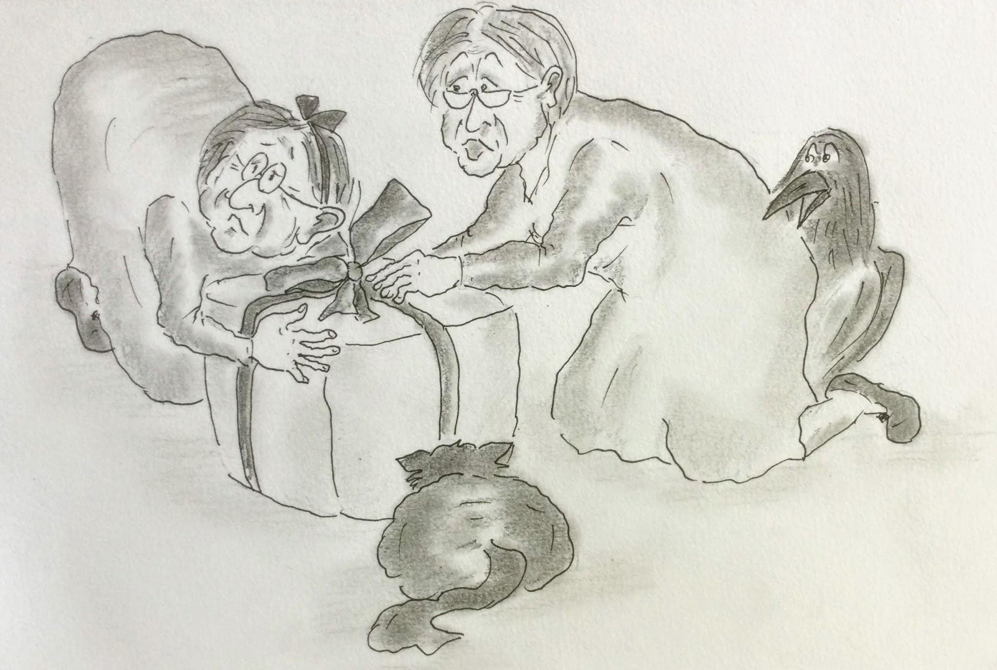 Тетя Маша прикладывала к коробке ухо, Баба Гуся пыталась уловить какие-нибудь запахи, Муся шевелила усами, а Ворона просто терпеливо ждала. Баба Гуся развязала ленту и открыла коробку. Из коробки показалась голова… потом еще одна…а потом оттуда выпрыгнули два маленьких симпатичных человечка!!
